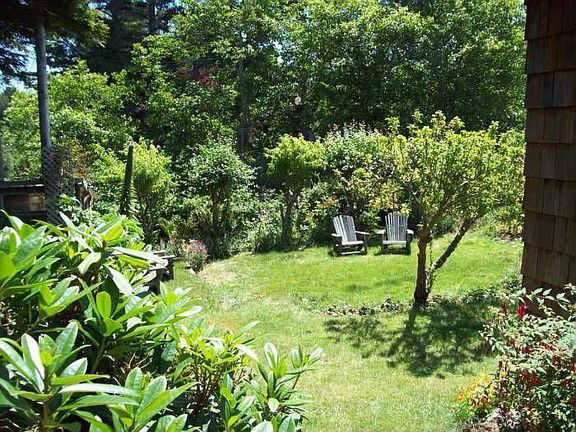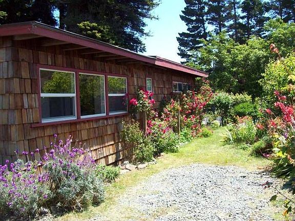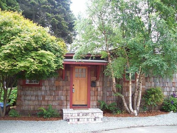 Located in a wooded and private setting with views of the forest, with blooming colors and tall redwoods on the property, and situated at the end of the road location, but right in town and only a short distance to Old Town, downtown, and the high school, this 1930 built redwood and cedar sided Cottage is charming, unique, artsy and has great character and will appeal to the buyer who is looking for something different and wonderful. The owners have lovingly cared for this home and raised their family here. Bursting with colors, the oversized 90x110’ tree studded lot features a variety of fruit trees and is a gardener’s delight. Relax in your private surroundings. A large storage shed and second outbuilding are also included with the property. It’s easy to visualize relaxing summer bar-b-que on the large deck that overlooks the backyard, or relaxing in your Adirondeck chair sipping a refreshment. Brand new brick steps greet you as you walk through the front door. A multitude of windows allow lots of light at the same time enjoy the natural surroundings. Very open floor plan. The kitchen had been remodeled with tile counters, maple cabinets, gas stove, and original wood windows that overlook the property. Large freshly painted living room features open beam pitched ceilings, wood floors, doors that lead out to large deck. The interior one story living space features 3 bedrooms, 1 ½ baths, including a large master bedroom that was added by the current owners, and a period style bathroom with a classic claw foot tub, wainscoting, pedestal sink. One of the bedrooms has an Armoire instead of a closet. Most rooms in the house have a view of the surrounding greenery. There are two heat sources natural gas for comfort. There is also the added benefit of inside laundry. The master bedroom, with wood floors, 2 closets, a ½ bath, is spacious as well as private, with more views of the surrounding greenery. This is really an amazing find. Privacy, wooded views, quiet surroundings, but great character and charm, for only $214,500. This won’t last long. Call Jeff Katz, Broker to see this charmer today!
