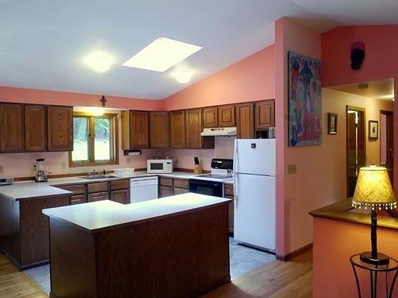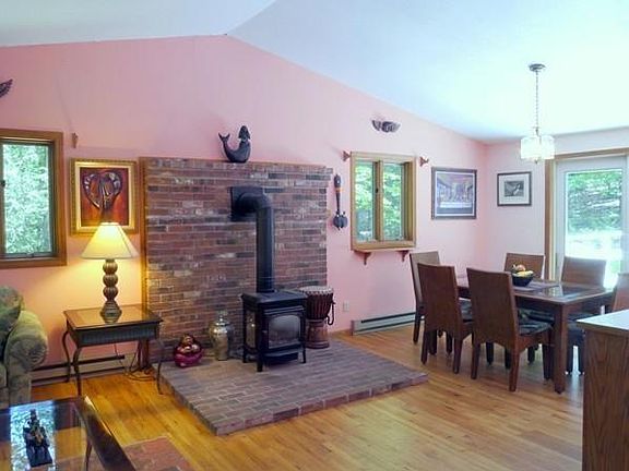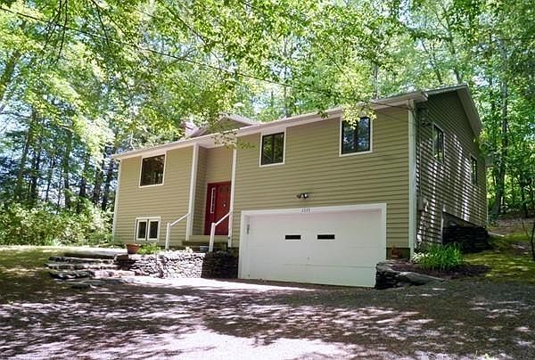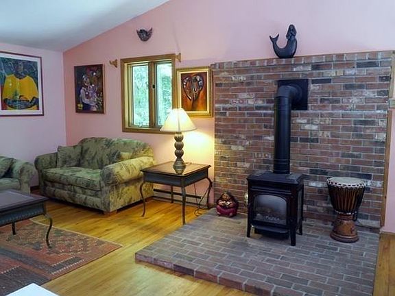 South Amherst split level exudes comfort and joy! Airy and bright with cathedral ceilings with views of the landscape from every window! Gas fired stove in upper level makes your space cozy and warm.Hardwood floors throughout the open dining/living area as well as the hall. Great home for entertaining as you can interact with guests while preparing food in the kitchen! Nice deck off the back overlooks your private backyard.Amenities include a newer roof, an extra flue if you decide to supplement the heat with a wood or pellet stove located in the lower level. The lower level consists of a large open room with huge built-in bookcases which will make organization a snap! Gorgeous Goshen stone entrance is most welcoming. Exterior was freshly painted in 2016.Two car garage. A lovely home with great bones.Add your personal touch to make this your dream home. Convenient access to the Robert Frost Trail for all you nature lovers. Bike to nearby town beach!