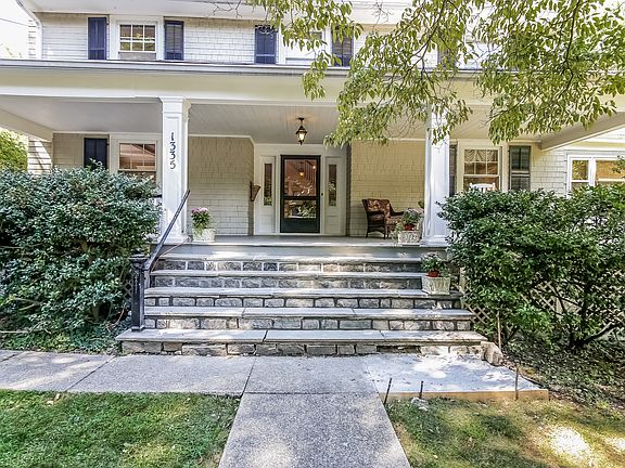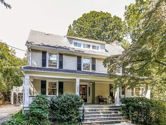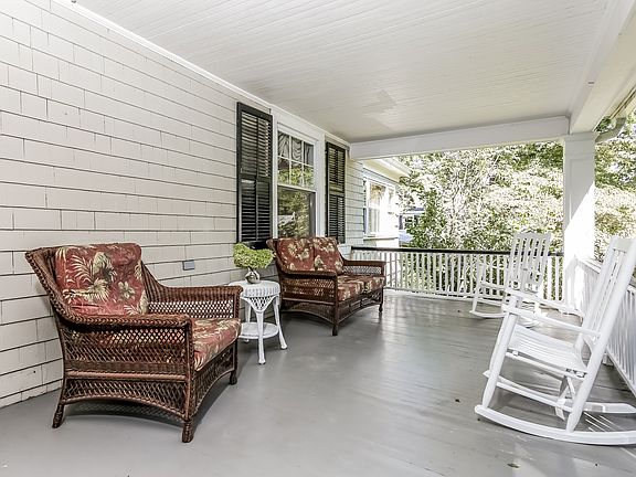 With a sweeping front porch in a tranquil setting overlooking a peaceful, friendly street, this home recalls a calmer era with breezy rooms filled with soft light and grace. A broad center foyer opens to living room with fireplace, built-in bookcases and french doors to an adjoining family sunroom and a formal dining room with original beamed ceiling and pocket doors