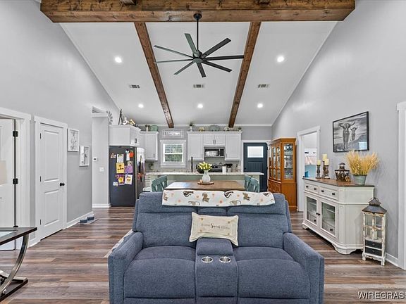 From the moment you walk in, custom wood beams and vaulted ceilings make a bold first impression. The open-concept living space flows into a stylish kitchen featuring granite countertops, custom wood cabinets, and soft-close doors—offering a perfect blend of charm and function. Both the kitchen and bathrooms boast quality finishes and craftsmanship.
