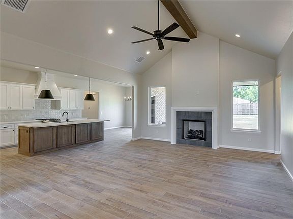 You won't want to miss this stunning custom design by Stephen Tucker homes, Inc.! This home features a large open-concept living/dining/kitchen space w/vaulted ceiling, recessed lighting, designer selected lighting package, custom wood beam and gas fireplace w/ tile surround and wood mantle. The custom-built kitchen features quartz countertops, tile back splash, large walk-in pantry w/built-in shelving, custom vent hood & a large island w/ pendants making it the perfect entertaining space. The split-bedroom floor plan offers 2 bedrooms with double sink vanity bathroom and the primary suite featuring a large double vanity plus makeup counter, walk-in shower and a free standing tub all located at the opposite end of home. An office w/sliding barn doors and built-in desk/cabinet is located off the living. A mudroom locker makes for the perfect drop zone when entering through the garage. The over-sized yard has full sod and is professionally landscaped . Call today to schedule your tour!