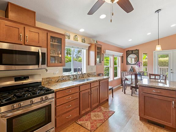 This very unique property on Maui's North Shore, located in Haiku, offers a fantastic location close to essential amenities like stores, restaurants, Haiku school, the post office and is only located 10mn to Paia and 20mn to Kahului. The home has 3 bedrooms and 3 bathrooms, plus a large office space. Two of the bedrooms are particularly unique, featuring their own separate entrance and an en-suite bathroom. This is unit A of a residential CPR. This home is designed with sustainability and efficiency in mind, including a water catchment system, a durable metal roof, and an array of owned photovoltaic (PV) solar panels. The interior is in immaculate condition and thoughtfully appointed with granite countertops, a gas range, vaulted ceilings, bamboo laminate flooring. The covered lanai offers a spacious outdoor living area, perfect for enjoying Maui's beautiful weather and for entertaining. This property combines the charm of island living with modern convenience and eco-friendly features, making it a wonderful opportunity for those seeking a comfortable and functional home in Haiku.