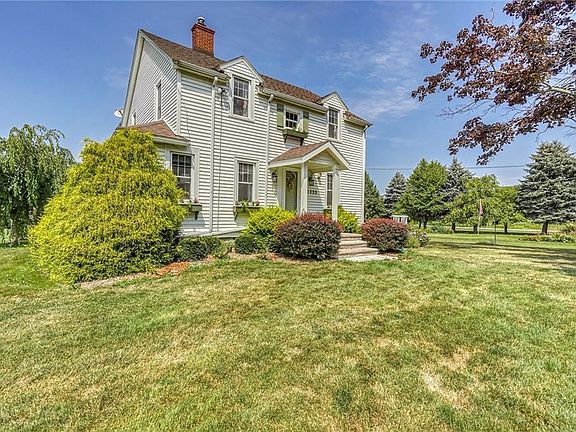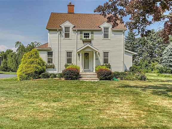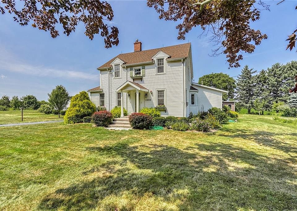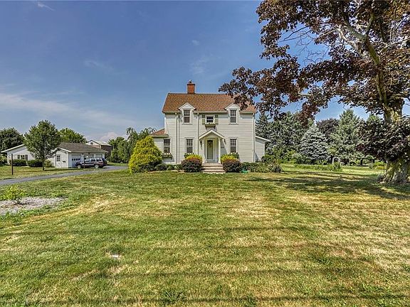 Come see this completely updated Ontario 4 bed 2.5 bath colonial on over 1.5+ acres w/ lake views in Spring/Winter. Floor plan is flexible with a Master bedroom on each level. Main floor features beautiful cherry hardwoods throughout, bay window in dining rm, spacious lv rm, half bath white cabinets, corian counters, tile backsplash & butlers pantry to die for! Huge first level master has tons of closet space & 1st fl laundry. Second level ~ pine hardwoods throughout 3 bedrooms including master w/ a walk in closet & private enclosed porch. Four outbuildings are great for storage including massive 3 car detached garage, chicken coop/playhouse, barn & 30X15 workshop. Updates include vinyl siding, vinyl windows, glass block windows, 200 amp electrical, roof (10'), on demand H20 & whole home heating system (18'). 2,184 Sqft measured by seller.