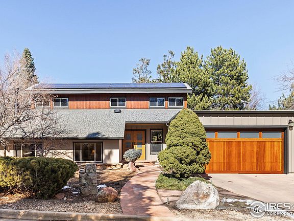 Rare and coveted opportunity to call this sought-after North Boulder enclave home. Tucked away on a tranquil cul-de-sac off Norwood & 14th in the hidden gem of the Applewood neighborhood, this exceptional home rests on a private, tree-lined 8399 sq. ft. lot adorned with lush, mature landscaping. A haven of serenity and possibility, the residence boasts dramatic vaulted tongue-and-groove ceilings and an abundance of natural light. The thoughtfully designed layout features a main-floor primary bedroom, with two additional bedrooms and 3/4 bath upstairs. An open staircase overlooks the inviting living room, adding a touch of modern elegance. A soaring two-story fireplace creates a warm and welcoming ambiance. Designed with energy efficiency in mind, the home includes an owned 4K solar system, radiant heat, and double-pane windows. The custom-designed kitchen is a chef's delight, showcasing solid 42" Wedgewood cherry cabinetry, soapstone countertops, and a Subzero refrigerator. The versatile den offers a cozy retreat with cork flooring, red birch desk and shelving, and a wood-burning fireplace. A screened enclosed porch invites you to savor Boulder's warm summer evenings in comfort, while a private backyard presents plenty of space for outdoor relaxation. Ample storage space is found in a two-car attached garage.
