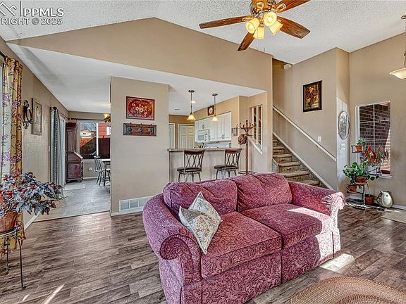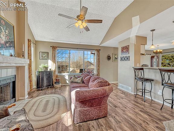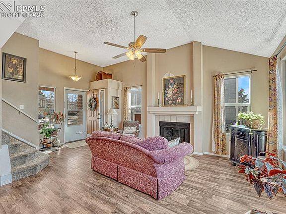 Welcome to this charming two-story home, perfectly situated to offer stunning views of Pike's Peak. The main level boasts soaring vaulted ceilings that create an inviting, open atmosphere. The spacious living room is anchored by a cozy fireplace, ideal for relaxing on cooler evenings. The kitchen and dining areas seamlessly flow to a large back deck with a pergola, offering the perfect space for both indoor and outdoor entertaining while taking in the breathtaking mountain scenery. Upstairs, you'll find three generously sized bedrooms, including a serene primary suite with its own private bathroom. The finished basement features a versatile family/rec room, perfect for movie nights or a home gym, plus a fourth bedroom and a 3/4 bath. Numerous updates: Roof, Water Heater, Oven, Pergola (2024), Furnace (2023), Flooring upstairs and main (2020), replaced windows in kitchen and living room, new sinks/toilets in bathrooms, replaced washer/dryer, added zero landscape in the front yard and turf in the back yard, planted perennials and trees! This home offers the perfect blend of comfort, functionality, and beautiful views, making it the ideal place to call your own.