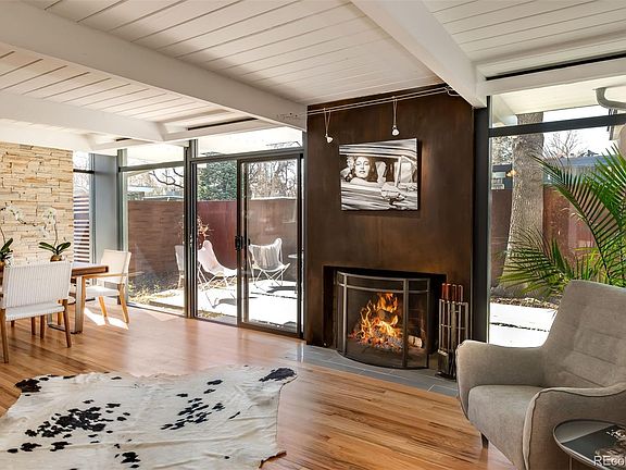 This Mid-Century Modern has been renovated and given new pizazz--yet is still rich in iconic architecture. The striking oxidized steel paneling that defines the south-facing courtyard grabs your interest from the curb. Inside, soaring ceilings and clerestory windows define the media/library room. Following along hardwood leads into the living room and open kitchen, where you'll find exposed beams and tongue and groove ceilings that marry floor-to-ceiling windows. The renovated kitchen is doused with natural light, full of space and features marble counters and high-end appliances, which makes hosting a breeze. The kitchen boasts the best view overlooking the living room's steel-clad fireplace and courtyard. In mid-mod fashion, the home effortlessly segues to the outdoor living areas with a patio and fenced backyard surrounded by refreshed landscaping. Revamped and upgraded bathrooms are decked with tasteful finishes, while the full laundry and mudroom provide convenience and comfort.