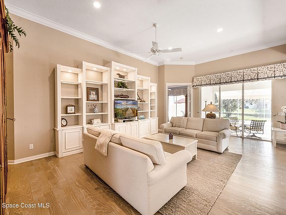 Enjoy serene waterfront views from the oversized screened patio with retractable awnings and double sliding doors for seamless indoor/outdoor living. Custom built-in bookcases in the living room and den, along with crown molding in the living room, primary suite, and den, add character and sophistication.