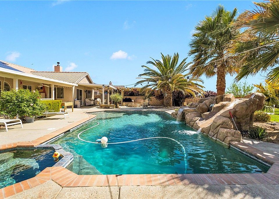 Welcome to this stunning five bedroom, three full bathroom home located on over a half acre of land in the highly sought-after community of Apple Valley. This home boasts updated bathrooms, tile plank flooring, as well as new carpet throughout. The backyard is truly a paradise, featuring a custom fire pit and gazebo barbecue area with built-in benches. The pool is perfect for hot summer days, complete with a waterfall, slide, and Baja step. Additionally, a shed is included for extra storage. The lush grass and palm trees create a beautiful oasis, perfect for entertaining friends and family. Don't miss out on this amazing opportunity to call this gem your own,