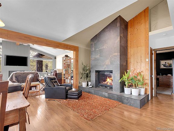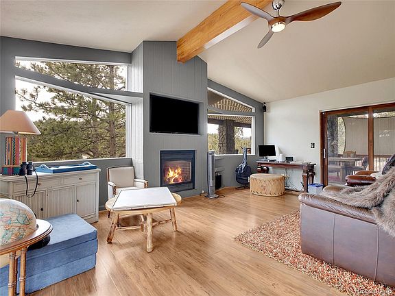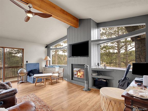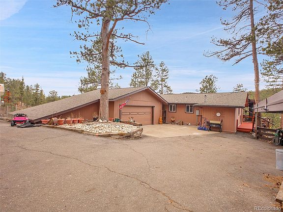 A Sanctuary in Nature! Nestled on a picturesque 1.01 acre corner lot, this exceptional mountain retreat offers the perfect blend of privacy and natural beauty. The gently sloping property is adorned with majestic pine trees, creating a serene woodland setting framing breathtaking views of Elk Creek. Step onto the covered deck and experience nature's majesty firsthand. Watch as elk and deer graze peacefully nearby, or catch a glimpse of bears in their natural habitat. This location provides a front-row seat to Colorado's magnificent wildlife display all while sipping your morning coffee. Entering the home, you're immediately drawn to the newly renovated fireplace - a stunning focal point that anchors the main living space with warmth and charm. The first floor also offers a primary bedroom suite featuring a luxuriously updated bathroom offering convenience and privacy for new homeowners. The lower level presents a versatile living option with a separate entrance, 2 bedrooms, a full kitchen and, a second living area, ideal for hosting extended family, creating rental income, or establishing a mother-in-law suite. Step outside to the lower deck and enjoy soaking in the hot tub. The lower level also has a well-appointed laundry room featuring full-sized washer and dryer, plus a dog wash/utility tub for your four-legged friends. The oversized 2 car garage with storage, a 3 bay carport and recreational vehicle parking leave plenty of room to store all your toys! This property isn't just a home. It's a lifestyle where modern comfort meets mountain living. Every season brings new natural wonders to your doorstep where memories are waiting to be made. The oversized 2 car garage with storage, a 3 bay carport and recreational vehicle parking leave plenty of room to store all your toys!