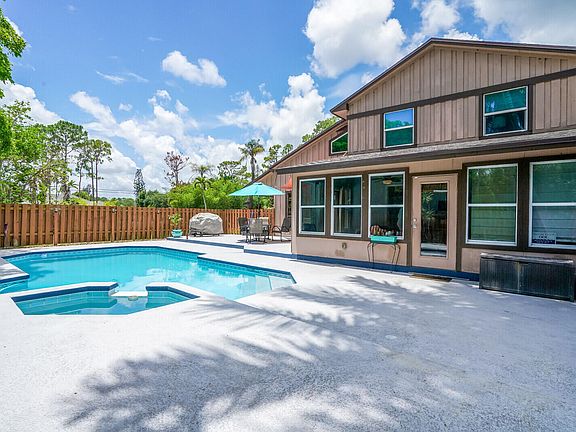 Gorgeous 3 bedroom, 2 bathroom with large FL Room overlooking the pool. This home features a lovely split level floor plan with the master bedroom on the entire second floor with a balcony overlooking the large 1.15 acre yard. The upgraded kitchen with brand new quartz countertops has plenty of storage and large island to entertain. The vaulted ceilings in the living room make a dramatic impact in the living space. This home is absolutely sensational for entertaining guests or just having the privacy of your own little getaway. Roof replaced in 2021, Security camera, solar powered driveway gate, new water system, 2 car garage and laundry, Impact windows on second level, Impact garage door, pool equipment updated. new shed, built in BBQ area.