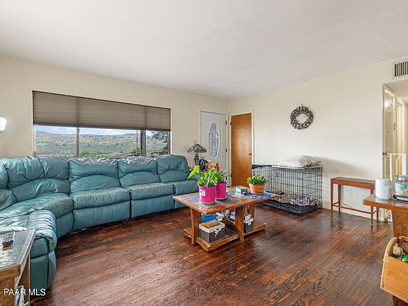 Charming home on a large .62 acre lot with mountain views! Splitting lot is possible allowing for another home on lower section of property. 3 bedrooms plus a bonus room, 2 bathrooms, 1,240 square feet. Recent upgrades include a new bathroom vanity, recent water heater & AC. Wood and tile flooring throughout. Spacious family room and dining room. Large Arizona room holds the laundry area and has potential for many uses - office, gym, crafting room? Great covered front porch with views! Exterior features mature shade trees as well as apricot and pear trees and grapevines. Plenty of room for your RV and toys. Shed on concrete base conveys, but hot tub does not. Schedule your showing today!