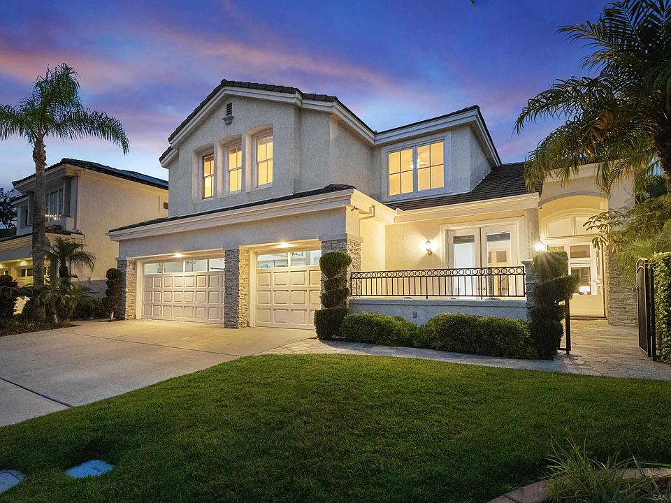 Situated in the prestigious Promontory community in Carmel Valley, this exceptional residence presents a spacious backyard, 5 generously sized bedrooms, and owned solar panels. The interior features upgraded LVP flooring, 3 elegant fireplaces, and dual-zone HVAC, while grand windows flood the space with natural light. The living room, boasting lofty ceilings, offers views of the expansive backyard and effortlessly flows into the inviting dining room with French doors, creating a seamless indoor-outdoor living experience. The lower level includes a versatile optional bedroom/office, a full bathroom, laundry room, and ample storage space. The gourmet kitchen, complete with a large center island, Quartz countertops, stainless steel appliances, and a walk-in pantry, overlooks the expansive family room, providing an ideal space for everyday living. Upstairs, the primary ensuite showcases vaulted ceilings, a jetted tub, a separate walk-in shower, and a spacious walk-in closet, alongside 3 additional bedrooms, including an extra ensuite. Outside, the property features multiple areas to explore with a gated stamped concrete courtyard entry, exotic fruit trees, and elegant palms, a fire pit seating area, and an above-ground spa with an attached sit-up bar, offering an idyllic setting for entertainment. The 3-car garage comes equipped with a Tesla EV charger, 2 water heaters, and a whole-house water softener system. Located within walking distance to Ashley Falls Park, this property offers the perfect blend of natural beauty and convenience with close proximity to scenic hiking trails, top-rated schools, shopping, fine dining, and nearby freeway access. The large backyard features a tropical paradise surrounded by a lush garden boasting an array of exotic trees and variety of fruit-bearing trees, including mango, sweet cotton candy grape vines, Java plum, guava (featuring two pink and one white variety), two flourishing pomegranate trees, banana, avocado, and a fragrant curry leaf plant. The garden also features an abundance of fresh herbs, including mint, and three varieties of vibrant roses.