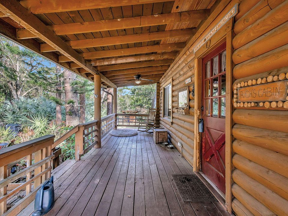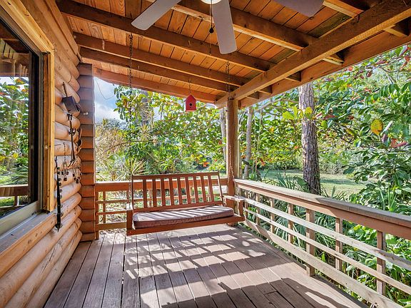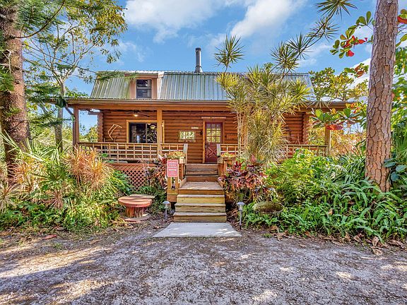 Country Living without being too far west. 2 Story, 3 bed, 2.5 bath Log Cabin home on secluded lot with Detached oversized Garage, Carport AND 1/1. The Log Cabin has all- wood interior with Living Room and Fireplace overlooking the backyard Pool and Tiki Bar. Large Dining Room with Kitchen and plenty of storage. Upgrades include Impact Glass Windows and metal roof for the Main House and Detached Building in 2021. Water Heater is 2021. The Lot is landscaped with mature trees and plants and Electric Front Gate provides privacy. Great entertainment area out back with the Tiki Bar, Pool, Fire Pit and more.