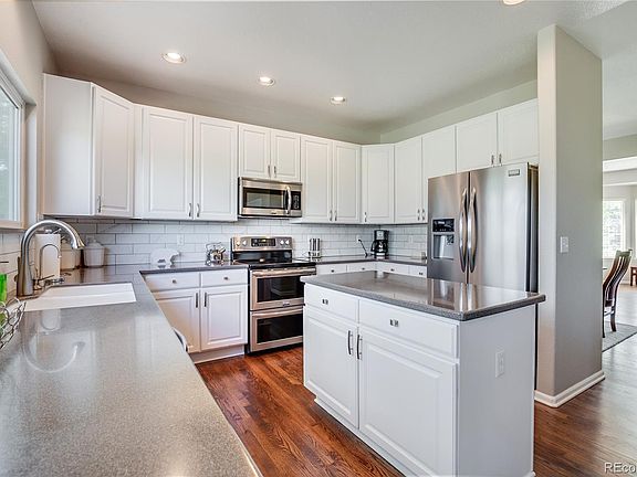 Backing to Thorncreek Golf Course within the highly sought-after Hunters Glen Community, this bright two-story home is sure to impress. Formal and informal living spaces provide ample room for any occasion. A warm and inviting family room with vaulted ceilings, a stacked stone oversized gas fireplace and large picturesque windows providing golf and mountain views. Prepare gourmet meals in the lovely updated kitchen with white modern cabinetry, sleek backsplash, stainless steel appliances, island and large pantry. The main floor also has a bedroom/office, bath with shower and laundry room. As you make your way to the upper level you will appreciate the beautiful hardwood steps that lead you to a spacious primary suite with an updated 5-piece bath and a walk-in closet, three additional bedrooms and a full bath. Retreat to the lower level with large rec. room, bar area, bath, and storage. Nestle in and enjoy the breathtaking sunsets from the impressive back deck. The home features many unique and special features such as stunning hardwood floors throughout the main level and stairs, newer roof and gutters, newer high-efficiency Lennox furnace, A/C, newer radon mitigation system, newer window wells with upgraded covers, newer exterior paint and more. Pride of ownership shows throughout this beautiful home. Enjoy the community's many wonderful amenities, pool, open spaces, golf, tennis, beach volleyball, clubhouse, paths, and pond. Welcome Home