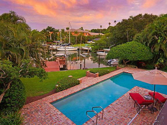 Known for being one of Sarasota's most desirable addresses, the waterfront homes in Harbor Acres are unique in their architecture and graceful in their design, and this stunning five-bedroom estate is no exception. Enjoy a prime position along 600' of protected boat basin and timeless home design that blends both the simplicity of the past and efficiency of today. Chicago pavers wrap around the nearly half-acre lot, offering a warm greeting with circular drive and garden-style escape on the 62' waterfront, open-air pool terrace. Double glass doors introduce a comfortable and thoughtfully laid out floorplan of rich hardwood flooring and soaring vaulted cedar ceilings with skylights. A gas fireplace makes a statement in stone in the formal living room and a cozy family room delights with water views. Glass sliders pull back to create to true indoor-outdoor experience that transitions beautifully to a pergola with full summer kitchen and seating for dining alfresco on cool winter nights. The gourmet kitchen is a complement to your inner host/hostess, boasting stainless steel appliances - including a 42" gas range from Wolf and Bosch dishwasher - prep/serving area, abundant storage and a central location that lends itself for entertaining everywhere in the home. Two master suites ensure all will sleep in comfort - one on the main level with access to the terrace and another upstairs that overlooks the water and astounds with full sitting room with fireplace and built-ins and a spa bath with soaking tub, dual vanity and oversized walk-in shower. His-and-her showcase closets accommodate your year-round Florida attire with ease. Two additional suites offer flexibility with the option to convert to a den, office, library or playroom. While you may opt to spend many of your days on the spacious pool terrace taking in lush landscaping and enjoying your personal Eden, adventure is steps away. Launch from your boat dock and get out to Sarasota Bay in minutes for a day of island hopping. A paradise for those truly wanting the full Florida lifestyle with both privacy and the convenience of being moments from downtown.