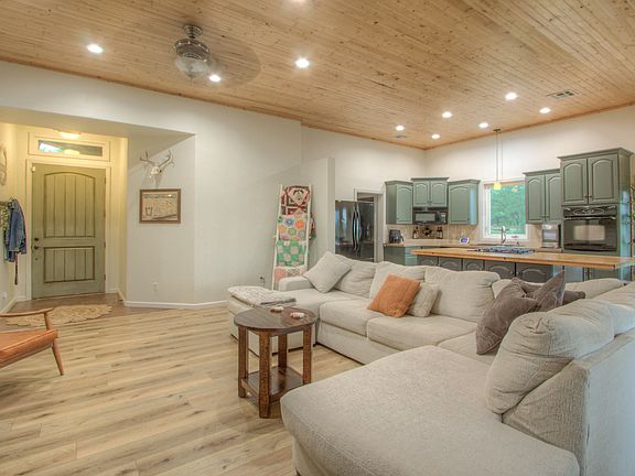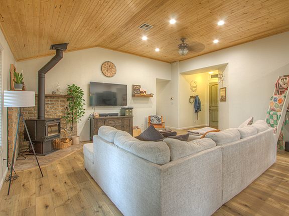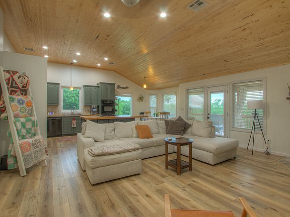 "BEAUTIFUL 5 Acre Full Brick & Stone Home. Mature Trees, Fire Pit, Stocked Pond, Prof. Landscaped. New Vinyl Plank Flooring, Freshly Painted, Tongue & Groove Ceilings in Living & Kitchen w/Concrete & Wood Counters. Open Floor Plan w/Wood Stove. Beautiful Lrg Main Bedroom, Walk-in-Shower w/2 Shower Heads, Walk in Closet. New Roof '19. New 4 ton A/C 2021, & Hydroflow Guttering. Gorgeous Covered Deck across the Entire Back of Home. Hot Tub and Spectacular Views". Short drive to lake/marina.