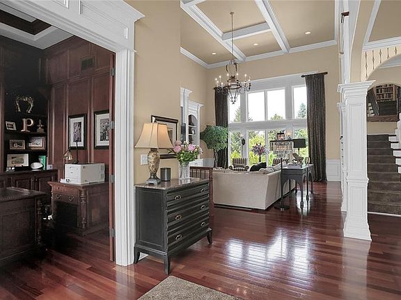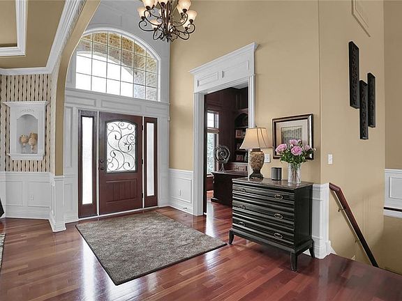 Luxury living on this classy Masterpiece! Custom in every way with no details spared, this 6 BR, 4 Car Garage home is perfection throughout! Exceptional 2 Story Foyer & Great Room w/ exquisite trim package, gorgeous Built-ins throughout home, exceptional ceiling details, beautiful Brazillian Cherry flooring, GRANITE counters on all levels (even the basement) and MAIN FLOOR GUEST SUITE. Gourmet Kitchen w/ center island, SS appliances and lots of counter space. Stunning Master Suite w/ gorgeous ceiling detail, sitting area & fireplace. Fabulous, spacious & bright walk-out lower level w/ theatre room, mini kitchen, bedroom & rec room. Private tree lined lot perfect for entertaining!