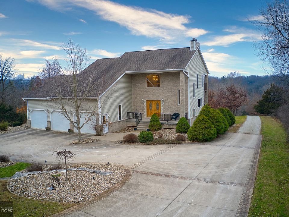 Beautiful contemporary 3 bedrooms, 4 bath home sitting on 11.22 acres. Open concept floor plan with see-through fireplace for the winter months. Enjoy the panoramic views of the surrounding countryside from your wrap around deck. The kitchen is a custom kitchen with Corian countertops and an eating bar. This home also has main floor laundry. The second floor offers a cozy loft space, spacious bedroom and bathroom with laundry. The main bedroom suite has it all, private deck, see through fireplace and large main bedroom bath. Walk out lower level offers even more entertaining space with 9' ceilings. Family room with wet bar and fireplace plus an additional bedroom & bath. Relax in the bright sun-room or in the gazebo. Plenty of room to store your toys in the 3 car attached garage.