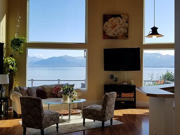 Wake up to panoramic mountain and ocean views from the loft, kitchen, dining, and living room. Watch Whales and seals off of your 500 sqft deck. Superior privacy on this 2 acre lot with full sun exposure. Enjoy a fire while watching the daily bore tides. 3 bedroom, 2 bath, large 900 sqft garage for all your toys. Close to fish creek and miles of trails. Truly heaven on earth.