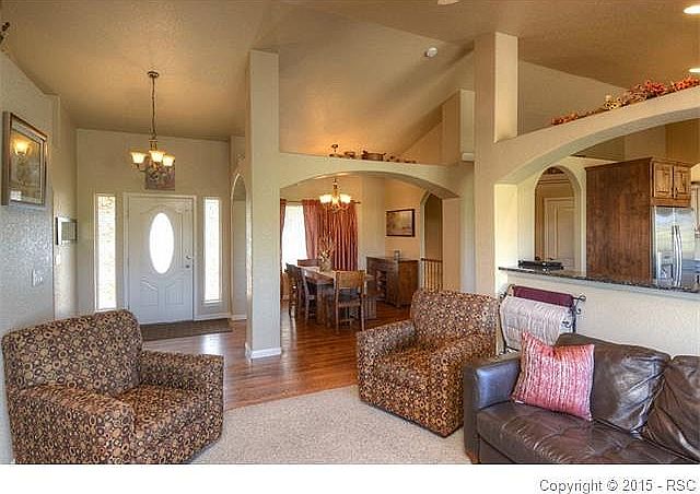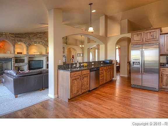 Stunning Stucco Rancher with Fully Finished Basement on Nearly 5 Acres Close-in to Falcon! You'll LOVE the Incredible Kitchen w/Gleaming Stainless Steel Appliances Including Wall Ovens, Refrigerator, Dishwasher, Granite Slab Countertops, Lots of Alder Cabinetry, Hardwood Flooring & Kitchen Nook with Window Framing the Gorgeous Pikes Peak Views! Open to the Living Room with Cozy Gas-Log Fireplace & Built-ins w/Attractive Stonework! Very Spacious Master Bedroom with Walk-out to Deck, Vaulted Ceiling, Walk-in Closet & Private 5-piece Bath! Formal Dining Room for Great Entertaining Area for Your Friends & Family! 2 Large Secondary Bedrooms, Full Bathroom w/Custom Tile & Upgraded Countertops Plus a Half Bath on the Main Floor! Downstairs has Extra Large Bedrooms 4 & 5 and Full-Size Bathroom! The Large Family Room Boasts the Second Gas-log Fireplace and Plenty of Room for an Exercise Area!