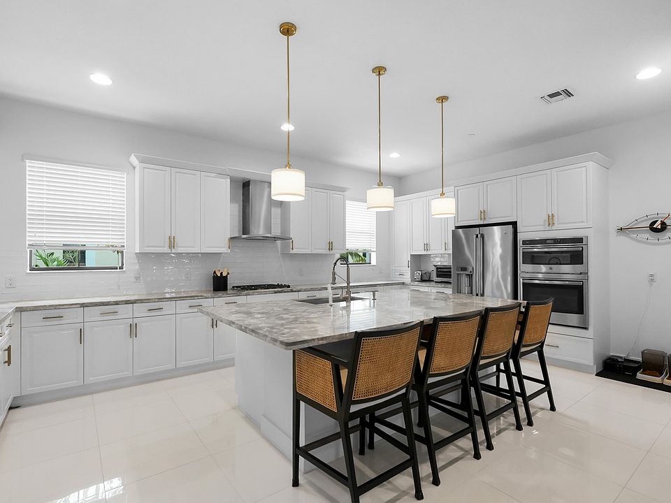 Stunning 4 Bedroom, 3.1 Bath Townhome in the Heart of Alton - 2,840 Sq Ft of Luxury Living. Welcome to this beautifully upgraded 3-level townhome offering modern luxury and effortless living in the highly sought-after Alton community of Palm Beach Gardens. With 2,750 sq. ft., 4 spacious bedrooms, 3.1 baths, and 2 private balconies overlooking serene lake views with fountains, this home blends style, comfort, and convenience. Step inside to find sleek white porcelain tile floors, recessed lighting, and designer finishes throughout. The ground level features glass French doors, built-in floating entry shelf, and a full bath that feels like a spa retreat. The bath is complete with frameless glass shower, upgraded tiles, a custom quartz-topped vanity, one-piece toilet, a backlit LED mirror, and all new Moen fixtures. The ground level also includes smart additions including push-button blackout shades, a modern ceiling fan, recessed lighting, and a central security keypad. The main floor is an entertainer's dream with a chef-inspired kitchen boasting marble counters, a new Wolf cooktop with commercial-style hood, built-in wall oven and microwave, three-door refrigerator, sleek cabinetry with modern pulls, and a convenient built-in pantry. A stylish half bath features a custom floating vanity with quartz counter, one-piece toilet, and backlit LED mirror. The open living area showcases custom built-in shelving with a rich walnut panel backdrop, designed to frame the mounted 65" flat screen for a sleek, modern finish. The master suite is a true retreat with push-button blackout shades, an 85" flat screen, ceiling fan, recessed lighting, and a central alarm panel. The master bathroom features a spa-like design with custom tile, dual marble-topped sinks, all new Moen fixtures, a frameless glass shower enclosure, and a space with a one-piece toilet. The master closet is fully built-out with drawers, shelves, and hanging space for optimal organization. The upstairs main bathroom has been fully renovated with a custom vanity, quartz countertop, LED backlit mirror, premium frameless glass shower enclosure, and all new Moen fixtures for a modern, spa-like feel. Bedroom 2 features built-in closets, 2" blinds, and a 55" flat screen TV, while Bedroom 3 offers built-in closets, 2" blinds, a custom quartz makeup table and desk, and a 50" flat screen TV, combining functionality with style for comfortable living. Additional highlights of this home include all-new premium pin-dot style carpet on the stairs and throughout, a central security system with cameras throughout, and a garage with epoxy flooring, ceiling storage racks, and an automatic door opener with outside keypad. The home also features a new water pump unit, hose hookups at both the front and rear of the property, and two private balconies with electric outlets that overlook beautiful lake views with fountains. Upstairs, the laundry area is thoughtfully designed with built-in cabinets and a new front-load washer and dryer, combining style and functionality throughout the home. Beyond the home, Alton offers an unmatched lifestyle. Residents enjoy a resort-style clubhouse with fitness center, kids' playroom, lap pool, playground, sports courts, and endless green spaces. Walk or bike to Alton Town Center for dining, shopping, and entertainment. Just minutes from beaches, golf, Palm Beach Gardens Mall, and top-rated schools including Marsh Pointe Elementary, Watson B. Duncan Middle, and Dwyer High. This home is the perfect combination of modern design, smart features, and community living. It is move-in ready and waiting for you!