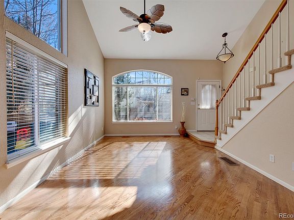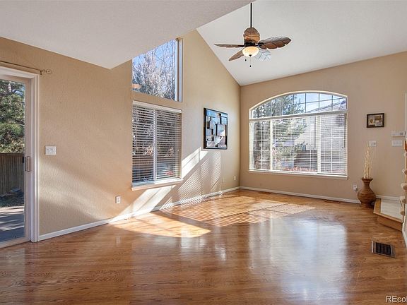 Terrific Oakwood-built patio home. The house has gleaming real hardwood floors on the main floor. Granite counters and stainless appliances grace the kitchen. Also on the main floor is a half bath and the laundry room. All of the appliances are included - washer dryer, refrigerator etc. There are two full baths, two bedrooms and a loft upstairs. The loft overlooks the great room and may be enclosed for use as an additional bedroom. The basement has been finished. It includes a 3/4 bath and a large open room that has been uses as a bedroom but would also make a fine recreation room. The garage is fully dry walled and painted. The garage floor has been professionally coated. Being located at the end of a short cul-de-sac driveway the backyard is larger than average for the community. The sub homeowners association clears the snow, maintains the front landscape, pays for trash and recycle removal. There is a private community pool and club house in addition to the Highlands Ranch recreation facilities.