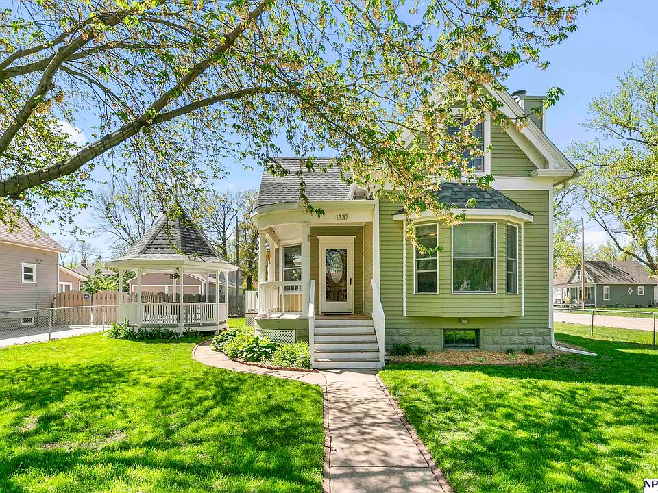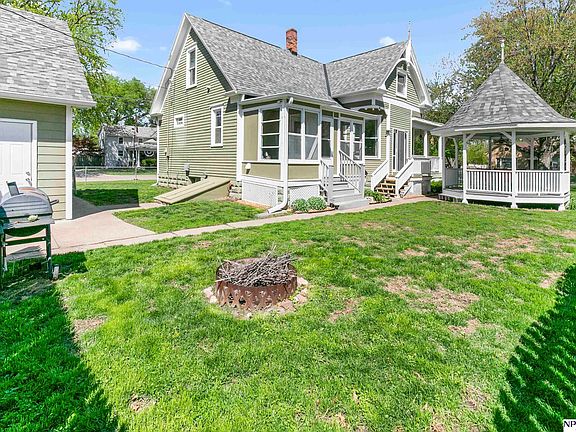 This home sits on a large fenced in corner lot with a gazebo and a covered front porch. The home has character and charm from 1905 and has been meticulously maintained and updated. The wood floors and large trim details on the main floor add to the inviting and open layout. This beautiful home has 2 bedrooms, a bathroom, and a laundry room on the main level as well as 2 additional bedrooms and an office space on the second level. There are 2 detached garages for a total of garages for 3 cars! The new roof in 2024 is a plus. All measurements are approximate.