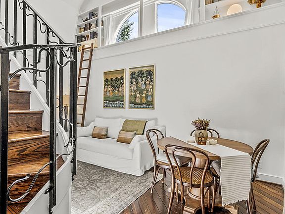 On the first floor, there's a two-story living room with built-in bookshelves. Off the living room, there's a room that can be used as a bedroom, den, or office. It also has a half bath, laundry closet, and storage. Going up the staircase with an iron railing, you'll find a loft area perfect for a reading nook. This space leads to an open bedroom with built-in bookshelves and a charming leaded glass window. The second floor also has an updated full bathroom.