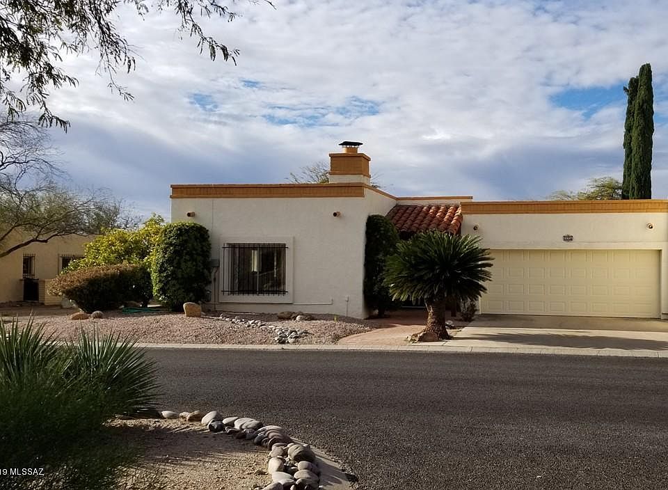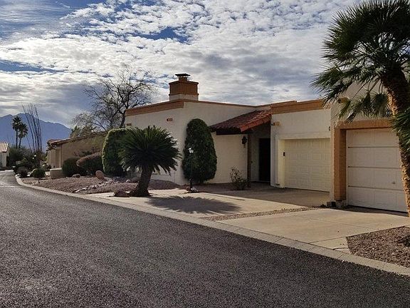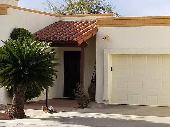 Awesome setting! End unit TH sitting on one of the largest lots in Desert Hills 3 East. Common area on the east side provides nice morning sunshine in the kitchen eating nook. Arched openings and passage ways, a gas log beehive fireplace in the L shaped living/dining rooms and saltillo tile in the wet areas all lend to the charming southwest feel of this home. Wait til you see the size of the master BR and 2d BR with a Murphy bed in the rear of the house that walks out to a deep covered porch and an open patio all bordering a huge arroyo below. You can see San Cayateno from here! This home is being offered fully furnished as you see it including pots, pans, linens, etc. ! 2011 Heatpump . Newer fridge, DW & MW. AND 2.5 car garage! Turn key opportunity priced for your updates.