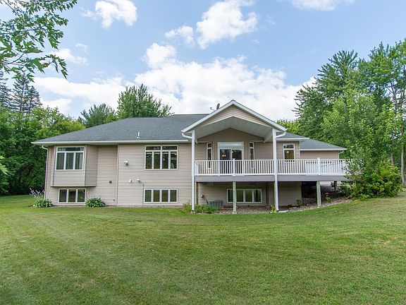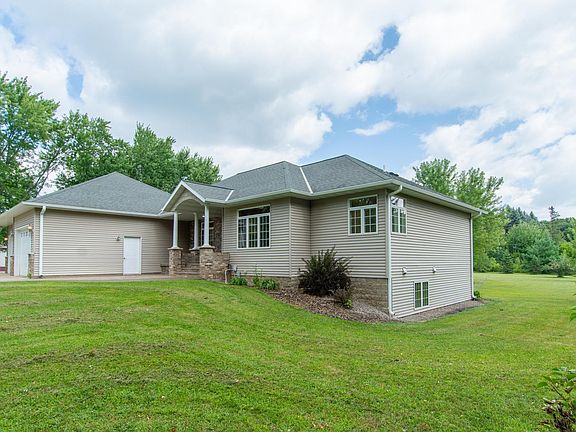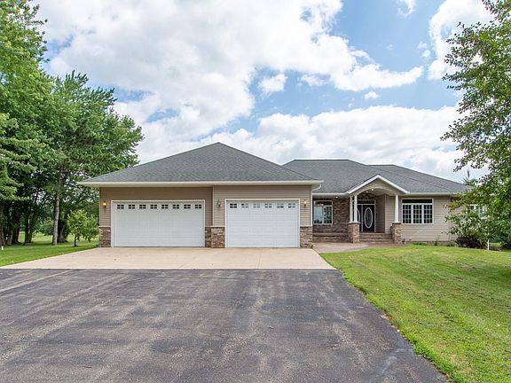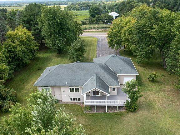 Picture perfect! This 3BR-3BA home on 6 acres features an open concept floor plan with bright and cheerful ambiance; kitchen with granite countertops and center island. On main level you find: 18x19 living room with built-in cabinets and gas fireplace, 9' ceilings and beautiful hardwood floors and woodworking. Primary bedroom with walk-in closet, full bath with jetted tub and walk-in shower; 1/2 bath and laundry room round out the main floor. The finished walk-out lower level has two bedrooms, full bath, 20x40 family room and an extra room plus tons of storage. Additional features include: Safe room in basement, wrap around deck, exposed aggregate porch, attached heated 3 car garage w/ floor drain, in ground irrigation system. The 40x120 pole building has 3 bays; 40x40 heated workshop and office area is plumbed and exhaust ventilation system, 40x40 bay with 16' high side walls, 32x40 bay with 15' door to accommodate a 38 ft RV. Small garden shed and large variety of apple trees.