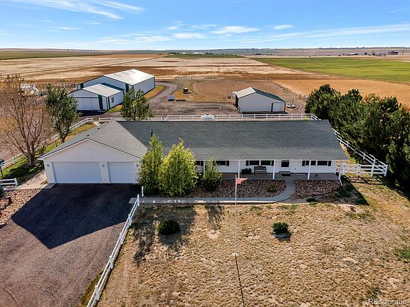Incredible views from this sprawling ranch style home on 40+ acres open floor plan new appliances/countertops and flooring 4 bed 3 bath/office great location just minutes from DIA 20 miles to Brighton secluded and quiet Equestrian enthusiasts delight complete with indoor and outdoor riding arenas/60'round pen/ barn 6 stalls/mats/tack room/feed room fenced pastures/grow your own hay \turnouts with sheds/hay shed with storage area/ This is a ready to move into property Bring all your toys and animals NO HOA!