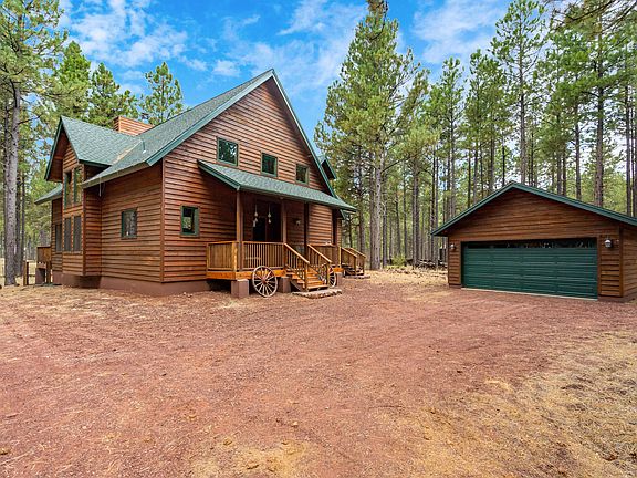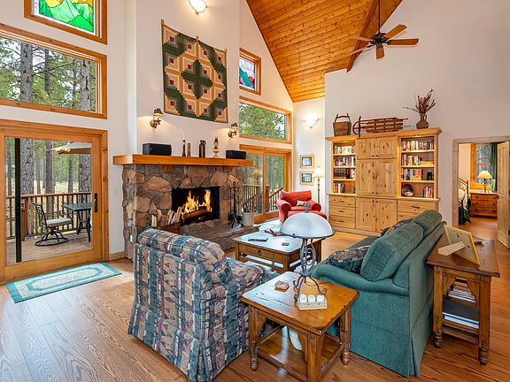 This is that cabin you have been waiting for! Tucked into tall ponderosa pines and backing to national forest, this beautiful wood-wrapped home has everything you are looking for. Step into a very large great room with hardwood floors, a soaring ceiling and a wood fireplace. A well appointed kitchen is just steps away and so is the huge back deck that looks out onto the serenity of the adjoining forest. The primary suite is on the main floor, with an en-suite bath, and a large walk in closet. Upstairs is a guest suite and a loft that serves as a family room or media room. It features a nice guest bath and lots of great places to lounge. Many outdoor rooms await as well, including the decks, fire pits and more. All looking at the forest. Take a look at the virtual walkthrough tour!
