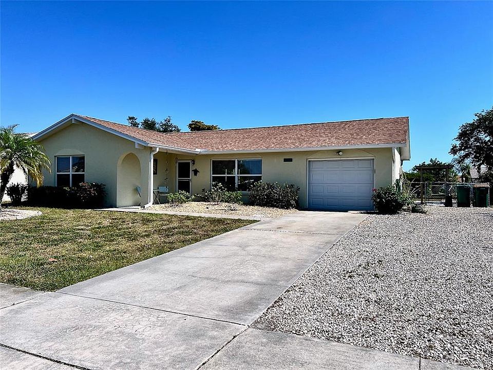 Welcome to your dream oasis in the Gardens of Gulf Cove! This meticulously maintained two-bed, two-bath pool home offers an unparalleled blend of comfort and luxury. Step inside to discover sleek tile flooring complemented by black granite counters and soft-close white clapboard cabinets in both the kitchen and bathrooms. Stainless steel appliances add a modern touch, while ceiling fans throughout ensure year-round comfort. Outside, a sparkling private heated pool awaits, accompanied by an outdoor shower for the ultimate relaxation. The spacious fenced backyard, complete with patio seating, is perfect for entertaining or enjoying quiet evenings under the stars. The property boasts a one-car garage with laundry facilities, screened doors, and a convenient man door leading to the backyard. Plus, there's extended RV-sized parking for your convenience. Nestled in a beautiful, well-kept neighborhood within an HOA community, this home offers access to a clubhouse, library, basketball court, fitness center, pool table, ping pong, air hockey, and more. With impact windows, professionally cleaned ductwork and regular pest maintenance, peace of mind is guaranteed. Additional features include a new shingle roof, a well for irrigation, and proximity to shopping, dining, and Gulf beaches. Enjoy the best of Florida living with low HOA fees and the opportunity to call this stunning property yours. Schedule a viewing today-and start living where others vacation! Bedroom Closet Type: Built In Closet (Primary Bedroom).