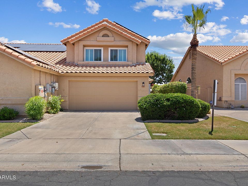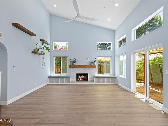 Exquisite Scottsdale Hills Remodel with Luxury Upgrades! This stunning 4-bedroom, 2-bathroom home features a versatile loft and a main-floor master suite. Enjoy modern elegance with sleek cabinetry, wood plank tile flooring, coastal-inspired paint tones, quartz countertops, contemporary fixtures, and seamless glass showers. The light-filled great room boasts vaulted ceilings, a cozy fireplace, and opens to a spacious patio, perfect for entertaining. The gourmet kitchen offers ample storage, an eat-up bar, a cozy nook, and a walk-in pantry. Outside, a private courtyard with custom pavers and shade sails creates an inviting retreat. Energy-efficient solar panels help lower utility costs. Ideally located minutes from grocery stores, retail shopping, and a community pool/spa. Move-in ready