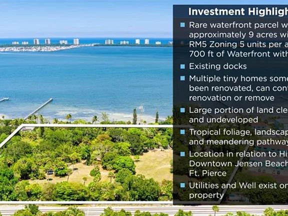 Discover Edenlawn Plantation—A rare waterfront opportunity with a rich legacy on Florida’s Treasure Coast! Welcome to nearly 9 acres of Florida’s history with remarkable water views and 700 feet of direct waterfront along the scenic Indian River Intracoastal Waterway. This sale includes 4 parcels. Its size, zoning, location, and storied past offer endless possibilities—whether you envision a private family compound, luxury estate development, boutique retreat, or the restoration of its historic legacy. A stately plantation home, now in disrepair, sits near the water’s edge on the northeast corner of the property. Originally, it was home to the region’s largest pineapple plantation. At its peak, the plantation featured a railway depot and a 1,500-foot dock that supported Florida’s growing pioneer economy. Several smaller cottages accompany the main home—each offering opportunities for restoration or replacement today. After the pineapple industry declined post-WWI, Edenlawn became a nursery and fernery, later a seasonal resort for the wealthy, and eventually a beloved Treasure Coast restaurant in the 1950s. Approximately half of the acreage is cleared and ready to be reimagined. Small homes remain on the rest of the property—many in disrepair, though some are habitable. The property includes three wells, 16 electric meters, a swimming pool overlooking the Indian River, pineapple statues, mature oaks, winding pathways, one functioning dock, and another with only the pilings remaining. This property is a true vision of the Florida coastal lifestyle. With whispers of the past blowing through the palm trees, it has inspired history books, the Zeke Adams fictional series, and the famous Highwaymen artist A.E. “Bean” Backus, who painted landscapes on and of the property. This is more than a property—it is an opportunity to steward a living piece of Florida history. All information was obtained from public records and is deemed to be correct. Please independently verify all information, including but not limited to zoning, square footage, utilities, local regulations, historical significance, and taxes. Do NOT go to or enter this property without the listing agent present. Sale in addition includes Parcel #'s 4509-130-0005-200-1, 4509-130-0009-000-7, 4509-130-0008-000-0. More photos and videos can be provided once prequalification received.