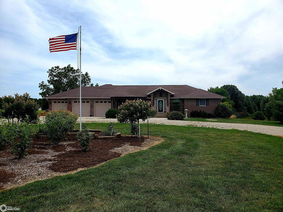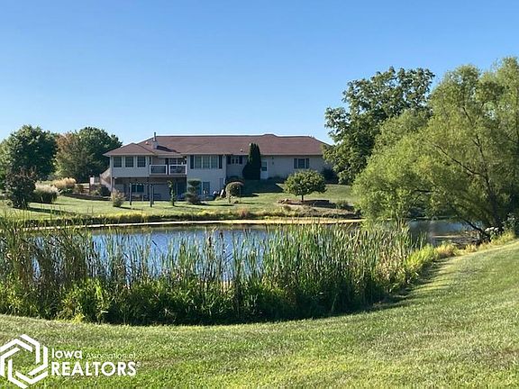 This residence is a TRUE JEWEL where you can enjoy the feel of a neighborhood, yet embrace the tranquility of a peaceful country setting. 1730 Square feet with a completely finished walk-out basement. Open concept floor plan, Living/Dining/Kitchen. Main floor Laundry. Main floor Master Suite with Sunroom with access to Deck overlooking stocked pond, Master Bath and walk-in closet. 2 Fireplaces, one up and one down. Walk-out basement features a second kitchen, family room, office, 2 bedrooms, full bath as well as a mechanical room and storm shelter. Storage shed big enough to hold a tractor and TOYS. Electrically Lighted Flag Pole in circle drive, electric available for other lights.3 car heated attached garage features yards of cabinetry and counter with air above for air tools, and a sink. There is an attic above the garage. Parking pad w/ electric for camper. Close to town/Golf. Schools are Burlington or Mediapolis. Fiber optic high speed internet. Master Bedroom curtains reserved.