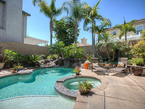 Welcome Home! This beautiful and flawless home tucked in the Rose Crest Community is the perfect family home and an entertainer's delight. This home has an inviting and spacious floor plan, which boasts 4 bedrooms plus a den with glass doors and built in desk that can be converted into a 5th bedroom. Conveniently this home has one bedroom downstairs. The formal dining room with French doors opens to a peaceful water fountain. The stunning kitchen is a delightful place to host a dinner party around the center island, an ideal space for a family get together. The kitchen also has top of the line appliances and striking granite. The master suite has his and her closets, and a luxurious spa-like en-suite bath, complete with a vanity and step up soaking tub. Walk into the backyard and you instantly feel as if you are at a resort! Imagine hosting a large gathering where guests can play in the elegant rock pool with fountain, gather around the outdoor counter for a refreshing drink, join the chef at the built in BBQ, and relax under the cool shaded patio cover. Late night, light up the spa and set the mood with the glass fire pit to enjoy the warmth on a cool night. Pride of ownership living at its finest and is ready for you to call home.