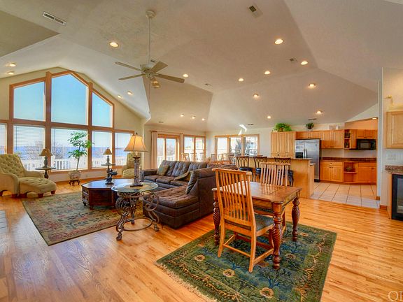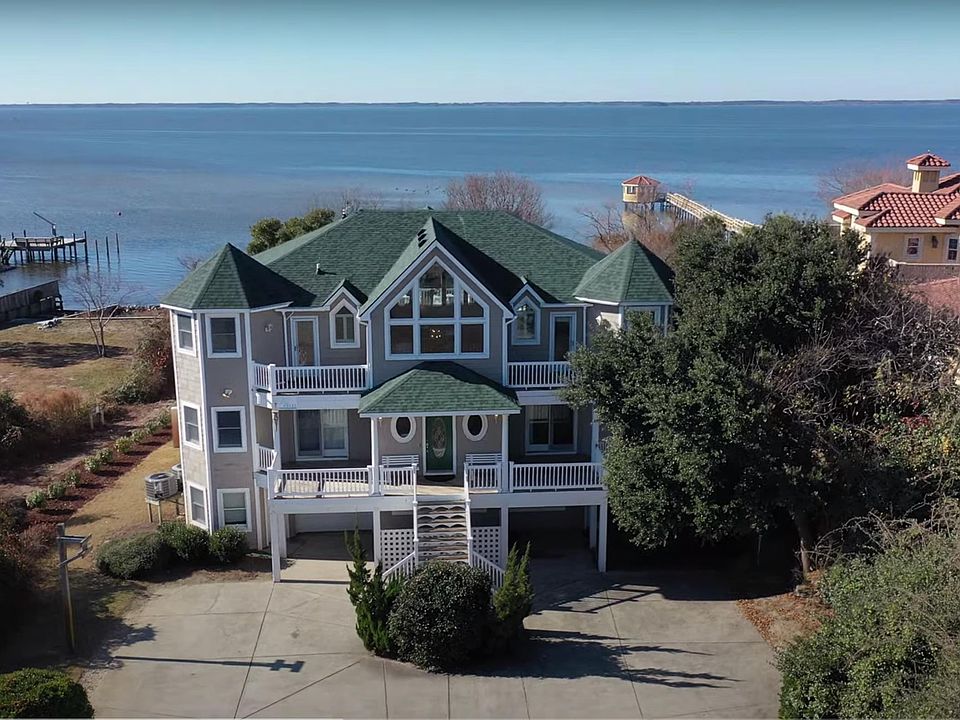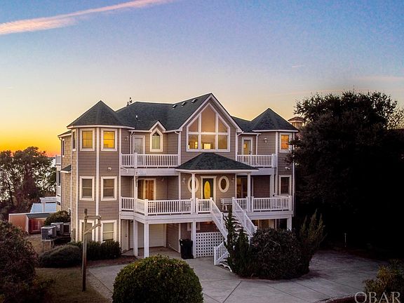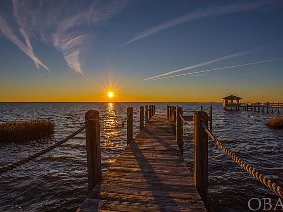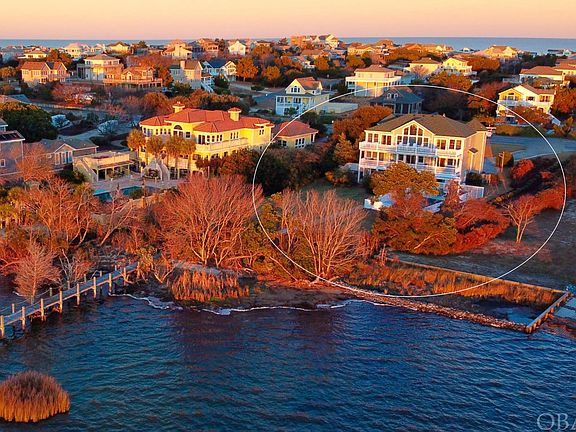 Majestically sited on 33,000 square feet of water frontage offering the most stunning sunsets on the outer banks. Rare opportunity to own a 7 bedroom (5 master suites), 7.5 bath soundfront stunner in the coveted community of Carolina Dunes. This home delivers it all. Amazing waterfront home with three functional levels of living and a favorite among renters. Enjoy all the amenities this waterfront estate has to offer, including; 5 min walk to the DEEDED beach access, a private pool, long pier, theater room, huge game room, and sparkling water views. The top level boasts a large great room with cathedral ceilings, a window wall of gorgeous sound views, hardwood floors, a gas fireplace, wet bar, chef's kitchen, a powder bath, and large dining area. The kitchen has shimmering granite countertops, ample cabinet space, eat-in bar, smooth top range, a double wall oven, 2 dishwashers, a microwave, and plenty of room for all the cooks in the kitchen. Enjoy the spacious sun deck where you can watch those famous OBX sunsets or the children playing in the pool. Also on this level is a convenient stackable washer & dryer, a grand master suite with a large private en-suite that includes a ceramic tile shower and soaking tub. The mid-level offers a large main entry, second gathering area (den) with a wet bar, and 4 bedrooms, three are master suites with private bathrooms. Two are on the soundfront with peaceful water views and direct covered deck access. Laundry facilities are located on this floor as well. The ground level has two more bedrooms, one, is a master suite with sound views, and the rest is dedicated to indoor and outdoor recreation. The fun begins in a recreation room equipped with a pool table, a large flat screen, and a theater room perfect for rainy days or movie with family after dinner. Doors from the rec. room open to a delightful array of outdoor amenities. Spend days splashing in a fenced private pool or lounge poolside in this tranquil waterfront setting. A walkway lead to a private dock stretching over sound waters. Water enthusiasts will enjoy sunny days paddling, boating, crabbing, or fishing. Please see associated docs for a list of recent upgrades. For aerial drone video copy and paste the following link: https://www.youtube.com/watch?v=77DBC6leZtg ; For 3D Virtual Tour copy and paste the following link: https://my.matterport.com/show/?m=Kmbw4cU6Axt&mls=1