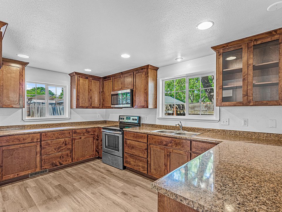 Charming move-in ready home in East Medford neighborhood! Boasting 3 bedrooms and 2 baths, this home offers a perfect blend of modern updates and classic charm. Step inside to find beautiful new laminate flooring that flows seamlessly throughout the home. The kitchen features ample counter space, updated stainless steel appliances and a convenient eat-in breakfast bar. Off the kitchen is the dining room, complete with sliding glass doors that open to the backyard. Both bathrooms have been tastefully refreshed with new vanities and toilets, and the entire home benefits from updated lighting fixtures and new interior paint. The backyard is a private sanctuary, featuring a large, open space surrounded by tall trees. It's a blank canvas for your outdoor vision, whether it's a lush garden, entertaining area, or simply a peaceful retreat. There is space to park or store your toys and a handy garden shed provides extra storage. Don't miss this opportunity to make this house your home!