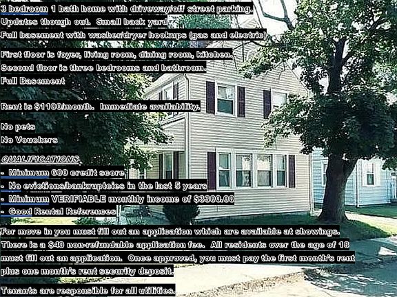 3 bedroom 1 bath home with driveway/off street parking. Updates though out. Small back yard. Full basement with washer/dryer hookups. First floor is foyer, living room, dining room, kitchen. Second floor is three bedrooms and bath. Full basement with washer/dryer hookups. Gas heat and hot water. Rent is $1100/month. Immediate availability. Pets under 30 lb allowed, maximum two pets with additional $25/month. No vouchers. No felons QUALIFICATIONS: -Minimum 600 credit score (TransUnion) -No evictions/bankruptcies in last 5 years -Minimum verifiable monthly income of $3300 -Good rental references For move in you must fill out an application. There is a $40 non-refundable application fee per application. Once approved you must pay first month's rent plus one month's rent security deposit. Tenant is responsible for all utilities. Tenant is responsible for all utilities, snow removal and lawn care