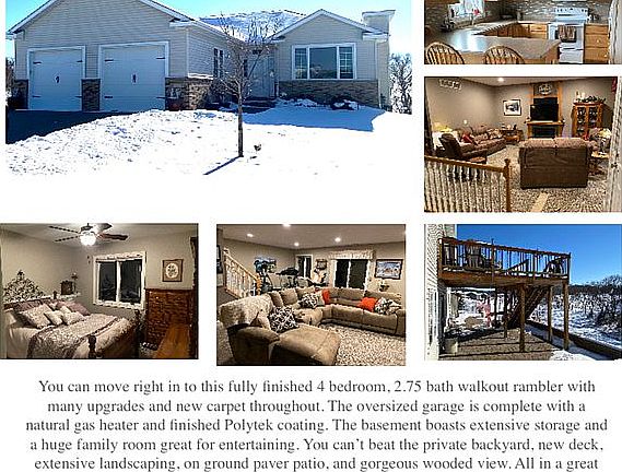 You can move right in to this fully finished 4 bedroom, 2.75 bath walkout rambler with many upgrades and new carpet throughout. The oversized garage is complete with a natural gas heater and finished Polytek coating. The basement boasts extensive storage and a huge family room great for entertaining. You can’t beat the private backyard, new deck, extensive landscaping, on ground paver patio, and gorgeous wooded view. All in a great Chatfield location with easy highway access, neighborhood park, and close proximity to schools and the golf course.