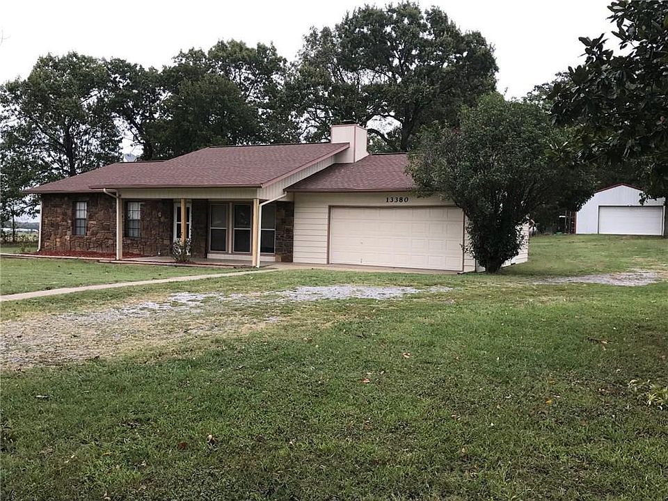 Beautiful home on 2 acres, on pavement! Nice open concept throughout the kitchen, living room, and dinning room. Gorgeous eat in kitchen with bar looking into the living room that boasts a native stone fireplace. 3 bedrooms 2 baths 2 car garage with dining room and laundry room that can double as an office! Home was remodeled 2 years ago (new roof, new paint, new carpet and flooring). 24 X 32 insulated shop / garage with 10 ft side walls that has both a walk through door and garage door. Must see!