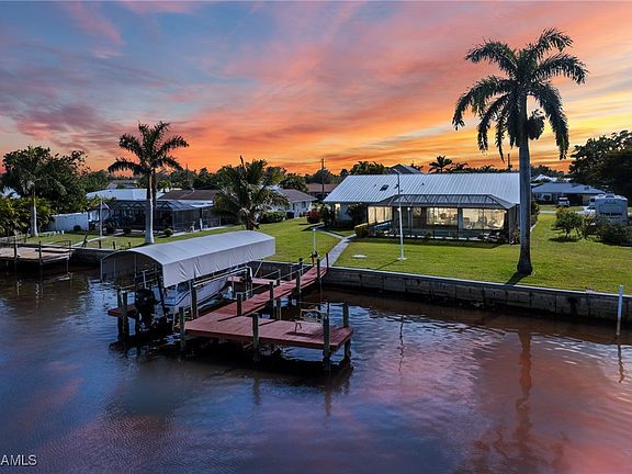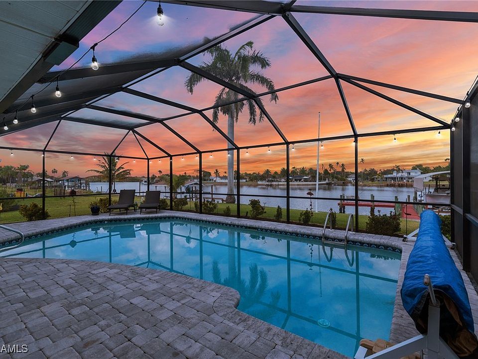 Tranquility and wide water views are yours to enjoy with this beautifully remodeled pool home on a wide 300'+ canal just off the Caloosahatchee River with direct deep water sailboat gulf access. Major renovations just completed, no expense was spared. New Kitchen and appliances, new bathrooms, new metal roof, new AC system, and a much much more. Take advantage of the Florida sunshine with your heated, screened enclosed pool with expansive under truss covered lanai area. The open concept split floor plan includes high ceilings, a spacious primary suite with breathtaking views and a elegant bathroom with separate soaking tub and shower, double vanity and atrium. Additionally there is a pool bath, indoor utility room and an oversized garage with size rollup garage door leading to a RV Pad with 50 am service. Boating enthusiasts will enjoy the 10,000 lbs boat lift with canopy and al around dock. Fort Myers Shores is an HOA FREE community with no subdivision restrictions and its convenient to 1-75 and downtown Fort Myers