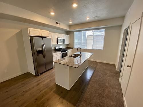 Newer energy-efficient 3 bedroom 2.5 bathroom townhome in the heart of Herriman. Modern kitchen with large island and almost-new appliances including a new fridge. Open plan with kitchen adjoining the dining and the living room with a balcony. Upstairs bedrooms including a well-appointed master suite with a private bath and walk in closet. Laundry room with washer/dryer hookups. Central air conditioning and heat, two-car garage. Included amenities such as club house with pool and front-yard maintenance!
