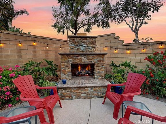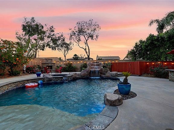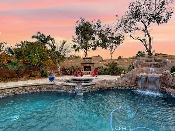 The backyard is a true paradise, boasting a saltwater spa and pool with a multi-tier waterfall and grotto, a gas fireplace, BBQ island with seating bar, and a kegerator. Multiple seating areas, an Alumawood patio cover, a dog run, and a garden bed area complete this outdoor haven.