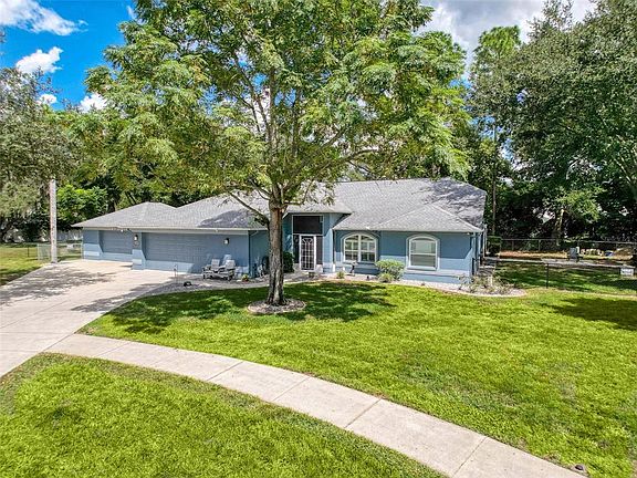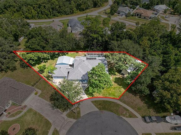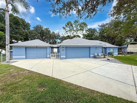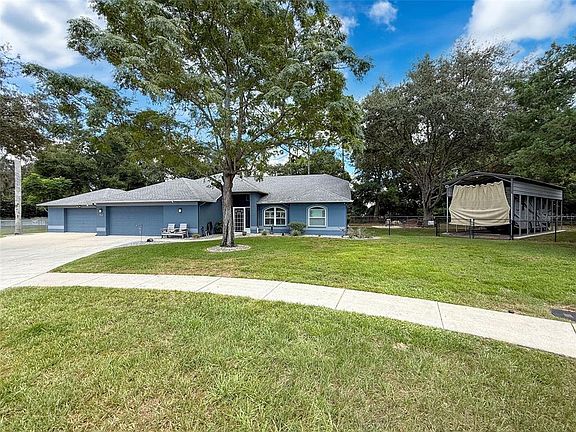 Welcome home to this cozy cul-de-sac, pool home with all the extras and updates you could think of! This 3 bed/2 bath home has been carefully updated inside and out! Inside you'll find a custom designed kitchen with crown moulding throughout, complete with built in dual ovens and open concept to the living room and dining, where family can enjoy company at the bartop seating or elsewhere. If the custom cabinetry isn't enough space, the walk in pantry and laundry room combo, will certainly provide more storage! With a desirable split floor plan, the primary bedroom offers privacy and convenience with dual walk in closets, ensuite bathroom, and access to the pool. No need to use the primary bathroom when enjoying the pool, as there's also bathroom access to the hall bathroom! The pool was remarcited in recent years and included solar heat, so enjoying the screened in pool for years to come will be a breeze. Outside, you'll continue your festivities with the paver fire pit, alongside the 14x40 RV carport that's equipped with 2 30 amp plugs for RV hookups! Space for toys and storage won't be a problem here, with the main 2 car garage, additional 2 car block garage with electric, storage shed on concrete pad, and the back 20x20 metal building that's equipped with both electric and air conditioning! When it comes to big ticket items to feel safe and sound, rest assured with new roof in 2020, water heater 2022, septic cleaned in July 2025, and new double pane windows in 2019. Additionally, outside you'll have permanent outdoor lighting with all the color options under the sun, gutters, and a fully fenced in yard to enjoy the .44 acre lot. Schedule your showing today to see all this home has to offer!