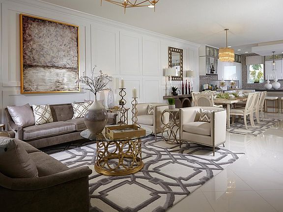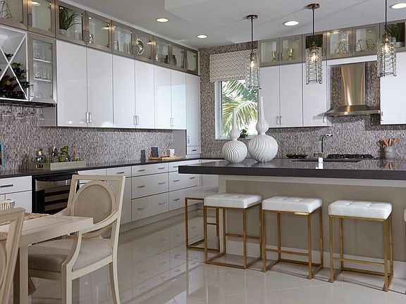Island exterior design, Town A interior unit. Gray gloss tile flooring throughout first floor Den and second floor Great Room. Large island Kitchen with white quartz countertops, GE stainless steel appliances, gas cooktop, wall oven and Cambridge Maple Paint Alabaster cabinets.* This Move-In Ready home in Alton is located in Palm Beach Gardens. Some home images may contain additional upgrades, finishes and/or features not included. Floorplan shown is base model and may not include structural options in this home.