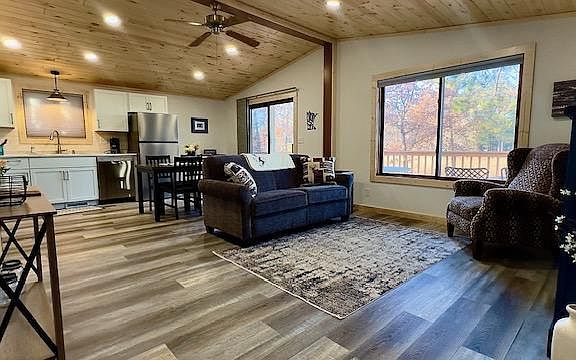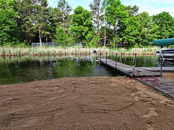 Great location on the Whitefish chain! Level elevation, sand bottom shore, great sunsets and perfect place to watch the fireworks! Short bike ride to town or around the lake. Remodeled 2-bed, 1 bath, year-round cabin with new kitchen, fireplace, huge deck, vaulted knotty pine ceiling. Lot is 3/4 acre, level with huge Red Pines and lots of room to add a garage with bunk house. Association includes private cement boat ramp, common sugar sand swimming area (just 2 houses away), tennis, basketball, ball field, and 16.4 acres.