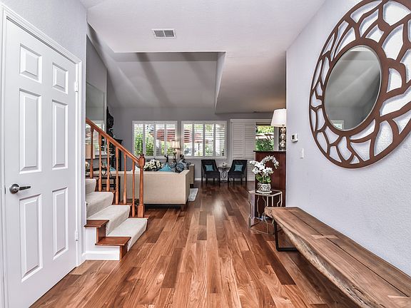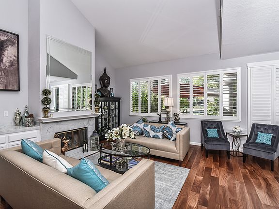 Designer perfect Canyon Lakes home. Relax in this beautiful renovated property with flagstone courtyard entrance. Plantation shutters, Brazilian floors, designer carpet, all new interior & exterior lighting, interior doors and drip system front and back. Master Suite features vaulted ceilings, walk-in closet, double sinks & separate tub area. The shower area has glass shower door with Italian glass tiles. Sliding glass door opens to new balcony overlooking golf course. The kitchen features stainless steel appliances, Italian glass backsplash, garden window & eating area with window bench seating. Downstairs bedroom overlooks courtyard. Downstairs hall bathroom is highly upgraded with Italian tiles, marble shower & vanity. High ceilings in living room, marble faced gas log fireplace, beveled glass mirror & storage area. Dining room slider leads to low maintenance backyard, decking and spa area. The 3rd bedroom currently exercise & dressing room, 4th bedroom is currently a bonus room.