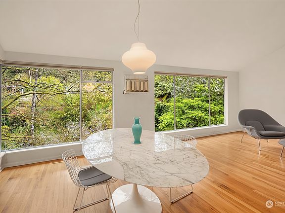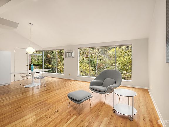 This Maple Leaf gem represents a private & serene paradise! Meticulously maintained, this pristine home has been adored! Mid Century Modern architecture with a modern interior that is open & bright. Spaces flow into the sun-filled living & dining rooms, with dramatic, vaulted spaces, floor to ceiling windows & sandstone fireplace. Four bedrooms, two bathrooms on the main level. The fabulous eat-in kitchen features authentic MCM details. The lower level boasts an awe-worthy artist studio / epic flex space with separate entrance! The WOW back yard offers thoughtful & lush gardens, this home is an in-city sanctuary with Thornton Creek as your zen backdrop. Proudly nestled on a quiet cul-de-sac & close to Light Rail, this home is so special!